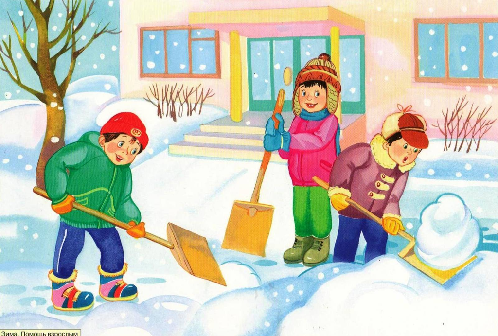 Правильно, ребята, к нам зима пришла! Посмотрите, как сегодня красиво! Сколько снега намело кругом, вся земля покрыта снежным покрывалом. Какой он, этот снег? (белый, пушистый, мягкий, серебристый). Что можно делать со снегом? (ответы детей). Правильно, можно играть в снежки, лепить снеговика, строить снежную крепость. Но сначала мы с вами должны узнать, какой снег и можно ли из него лепить и строить. Кто покажет, как правильно нужно держать лопату и набирать снег? Хорошо, мы выбрали Данила и Арину, они нам сейчас покажут. Для этого возьмите лопатки, наберите в них снег и подбросьте его вверх. Что произошло со снегом — он упал комочком или разлетелся легким облачком? (ответы детей) Верно, снег разлетелся легким облачком. Значит, он сыпучий, лепить и строить из него нельзя. Но нам необходимо навести порядок на участке. Что же нам для этого необходимо сделать? (ответы детей). Верно, мы можем сгрести снег в большие кучи, а когда потеплеет, мы сможем слепить из снега снеговика, зайчика или снежную крепость. А на каком участке удобнее и приятнее играть, на заснеженном или расчищенном? (на расчищенном). Скажите, как мы сможем расчистить снег на участке, что нам понадобится для этого? (лопатки, веники, санки с коробкой для перевозки снега).